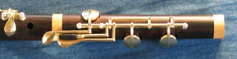All keys are made from nickel-silver and silver plated with a layer of gold to give a slight yellow shine. This combines very nicely with the boxwood rings. The key design is very ergonomic, all keys are easy to play (no pesky straight G# key!). The Cnat key works a charm with the side of the right hand first finger.