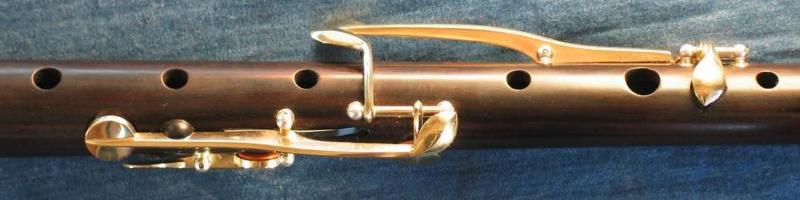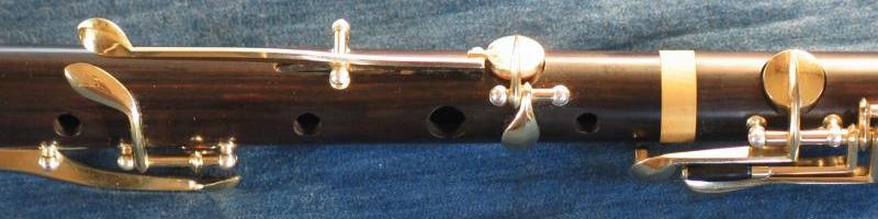 Dominic did a few modifications, like the bend Bb key, to accomodate my fingers better. The body is recessed at the Bb and short Fnat touches, so the keys open better and give a better tone. The touches have a little pad of felt to prevent noisy keywork. The springs have a metal plate recessed in the body to avoid wear on the wood.