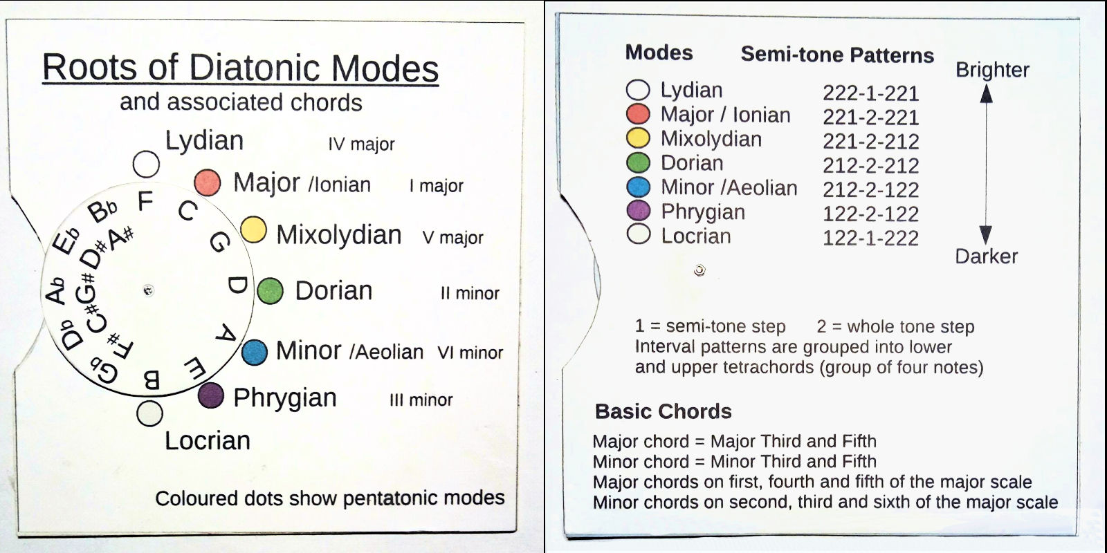 The photo shows front and back side of a little tool I made. It has an inner wheel depicting the notes of the circle of fifth, and an outer ring depicting all seven modes of the diatonic scale in descending order from a brighter to a darker characteristic, with five of them (marked by coloured circles) depicting the roots and notes of the pentatonic modes.